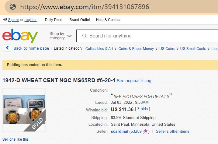To get an accurate estimate of the value of your 1942 S Wheat Penny, you can compare it to recently sold items. For example: