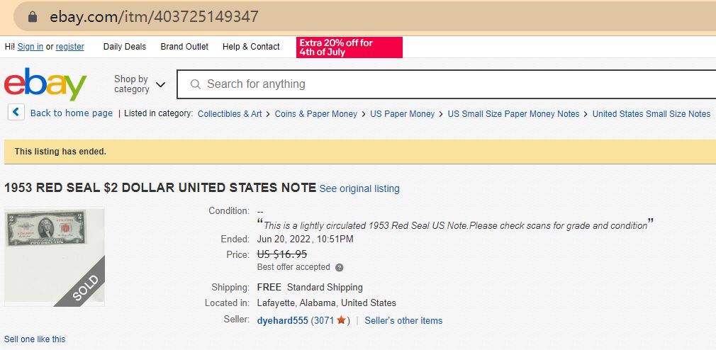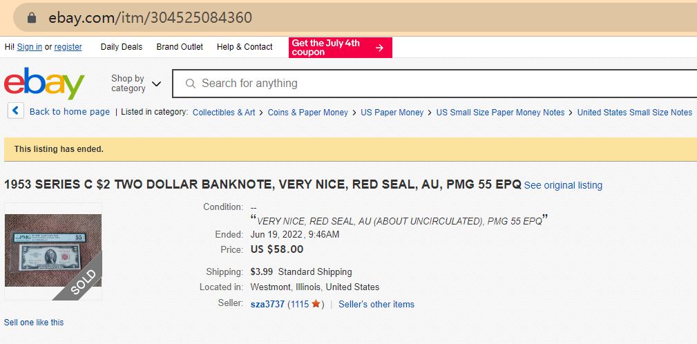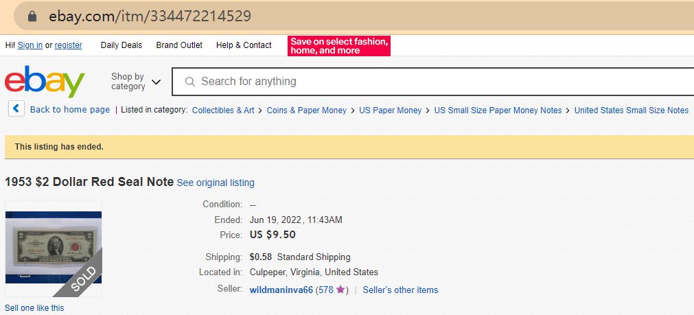 As you can see, Heritage Auctions is a great marketplace for red seal notes with unique features. If you have regular notes, your best bet is to list them on eBay. Let’s take a look at some of the recently sold examples on eBay: