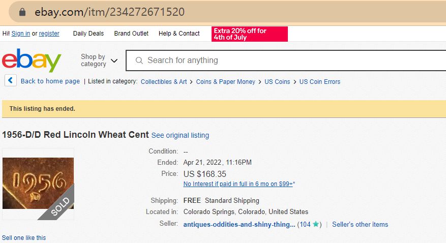 Also, Denver minted 1956 wheat penny with a double engraving error sold for $168.35 on eBay.