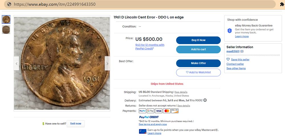 1961 D Lincoln Cent Error – DDO L on edge Price: $500