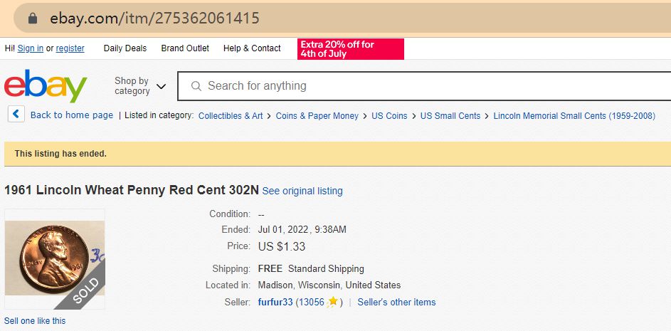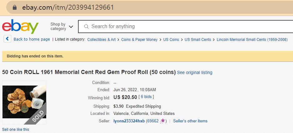 Let’s take a look at some of the recently sold 1961 and 1961 D Lincoln coins on eBay: