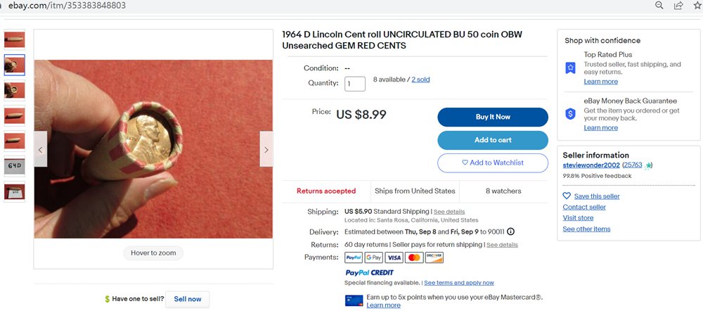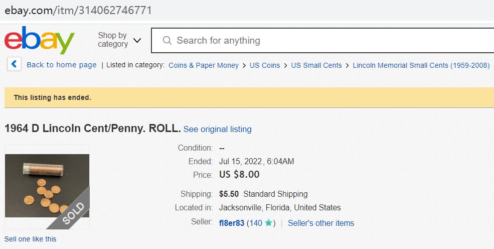 - A roll of 1964 D pennies in unknown condition sold for $8.
