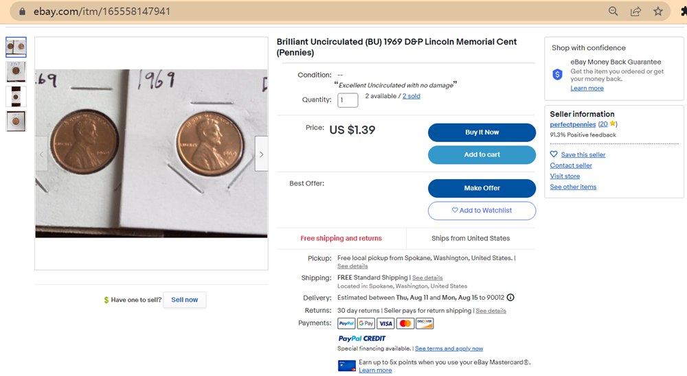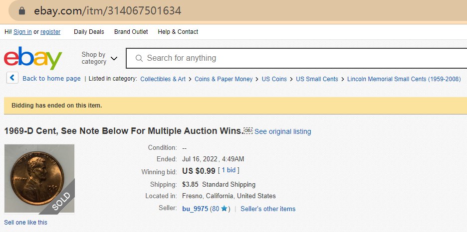 - Uncirculated and ungraded 1969 D penny sold for $0,99.
