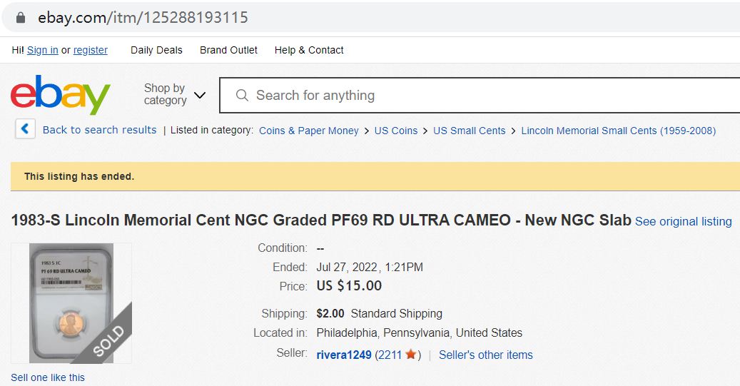 - A similar 1983 S proof peny graded PR 69 sold for $15.