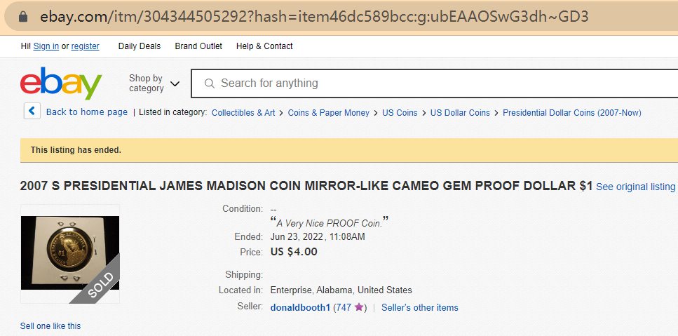 - Uncirculated 2007 P James Madison dollar coin sold for $3,75.